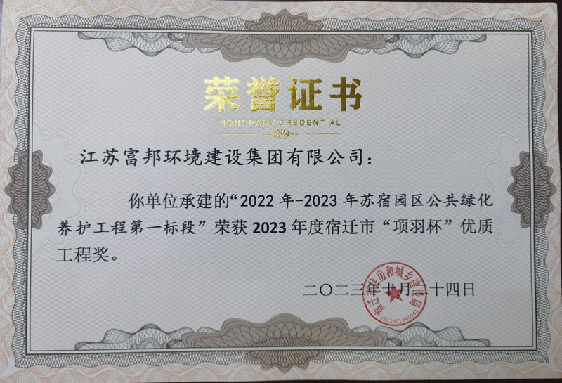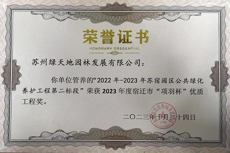 近日,由宿遷市蘇宿園區(qū)建設(shè)發(fā)展有限公司負(fù)責(zé)管理的蘇宿工業(yè)園區(qū)2022-2023年公共綠化養(yǎng)護工程第一、二標(biāo)段,同時榮獲2023年度宿遷市項羽杯優(yōu)質(zhì)工程獎。