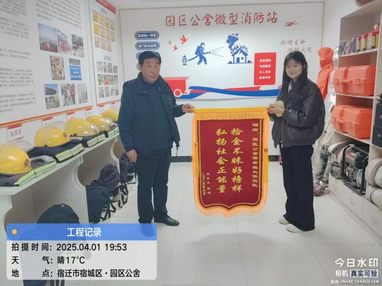 4月1日晚,園區(qū)公舍住宿員工為保安班長(zhǎng)任益臣送來(lái)一面錦旗,對(duì)他的拾金不昧表示感謝。